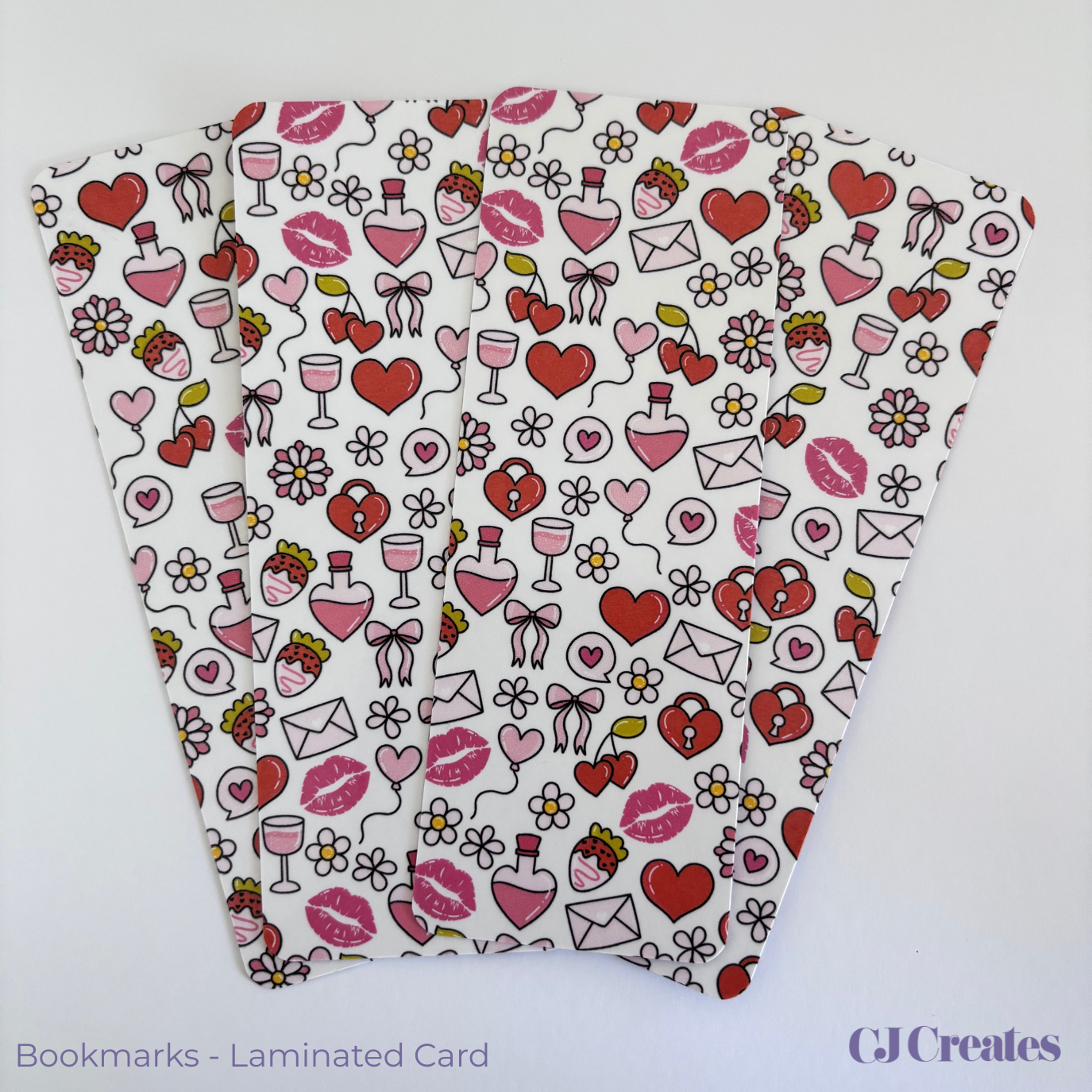 Introducing Love trinkets Laminated Bookmark, a must-have for every booklover! Featuring gorgeous patterns of hearts, strawberries, and love potions, this bookmark is sure to make reading even more enjoyable. Keep your place in style with this laminated bookmark that's both durable and charming.